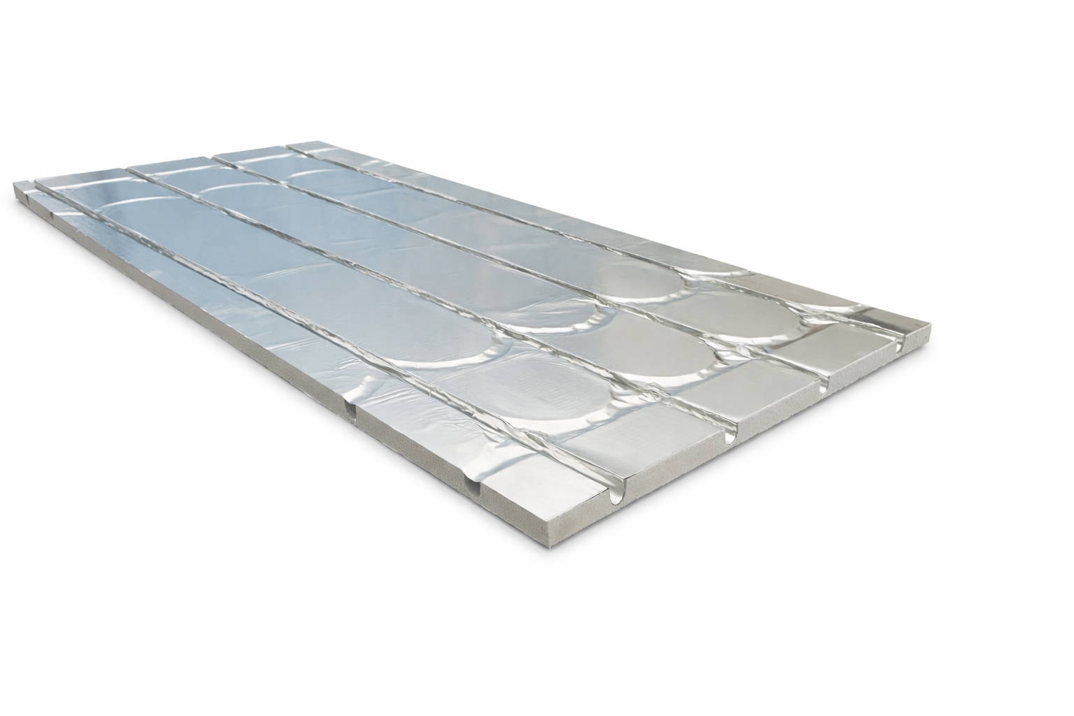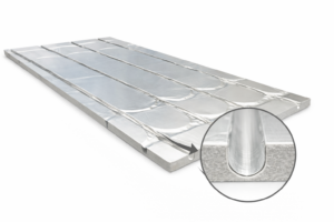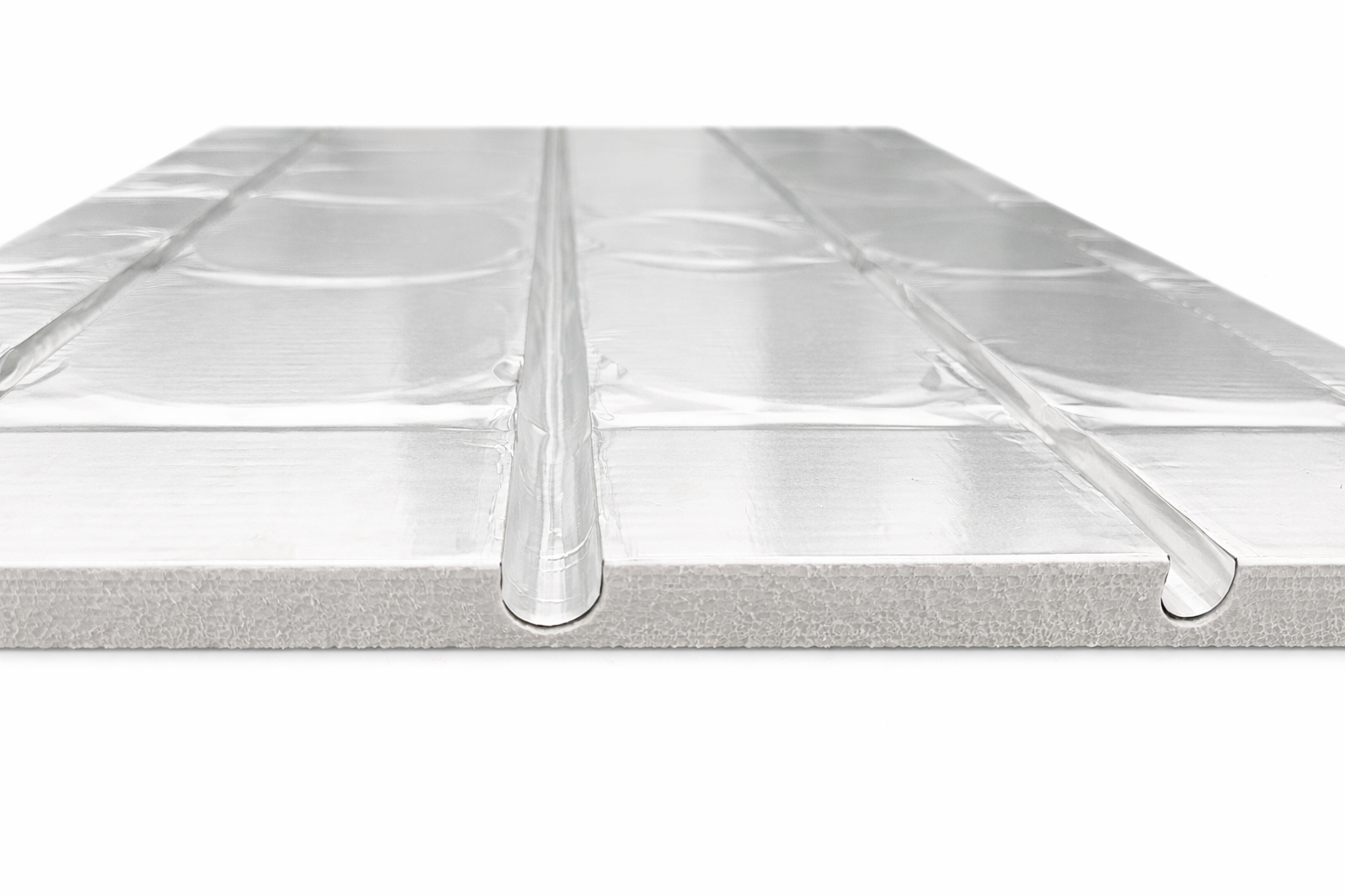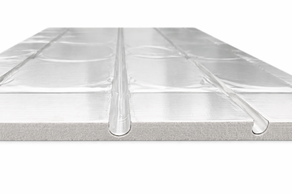 Płyty systemowe BEFIRO XPS + folia aluminiowa 0,1mm na całej powierzchni płyty i dnie rowka do wodnego ogrzewania podłogowego.